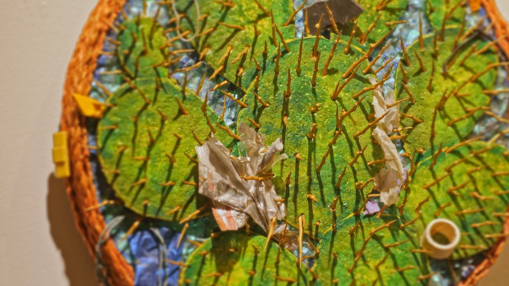 One of the artists in the show, Aleida Garcia (she/her/ella), created jewelry pieces for “Microplastic” to reclaim the sacred. She shared, “In a world where it’s just full of trash and refuse, how do we make sense of that and what do we carry as sacred?”