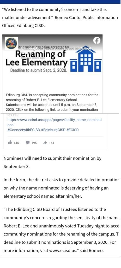 To their credit, Edinburg Consolidated Independent School District (ECISD) was responsive and quick to establish a process for the community to nominate individuals for the new name.